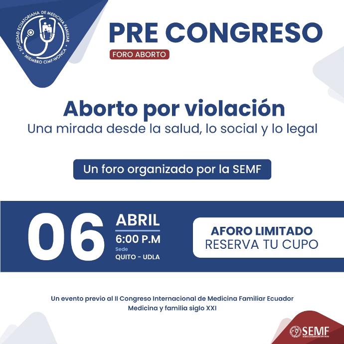 La aprobación de la ley del aborto por violación bajo las condiciones determinadas por la Asamblea Nacional ha abierto un debate profundo y vigente en los diversos ámbitos de nuestra sociedad. Ahora que se acaba de confirmar un veto parcial por parte del Ejecutivo a esta ley, la Sociedad Ecuatoriana de Medicina Familiar ha organizado un espacio de reflexión alrededor de este controversial tema, desde el punto de vista médico, legal y de la realidad de las mujeres en nuestro país.